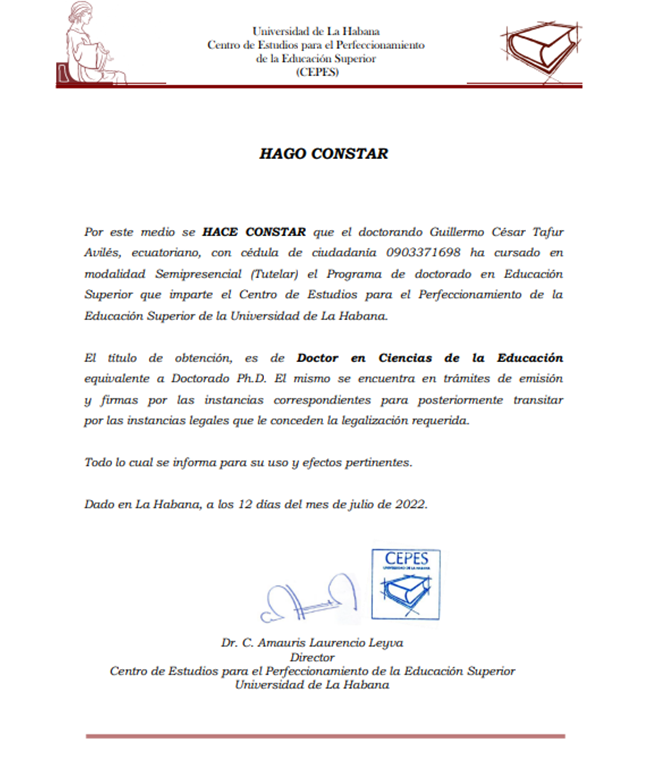 En esta Página Web, encontraran la obra de Guillermo Tafur Aviles, Compuesta básicamente por 7 libros motivacionales, 2 institucionales y 2 Académicos, además de 6 artículos científicos publicados en Revistas indexadas. Adicionalmente se ha incluido su Tesis Doctoral PhD. en “Ciencias de la Educación” de la Universidad de La Habana, Cuba, la cual sustento el 01 de abril del 2022.
